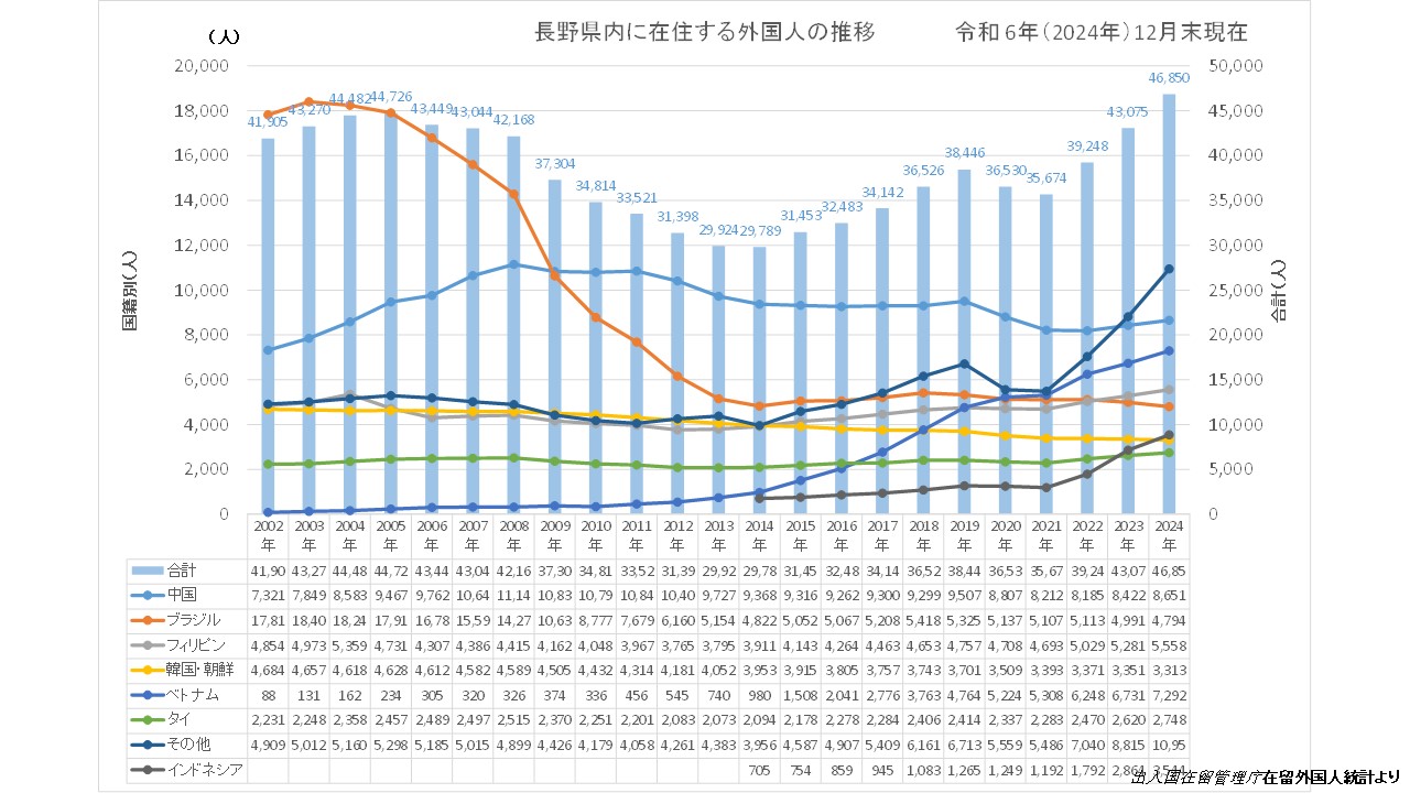 - 令和6年12月末現在の長野県在住の外国人住民数は、令和2年から令和3年にかけて2年連続で減少となったが、令和4年より増加に転じ、前年同比 3,775 人増加の46,850人( 8.06 %)で過去最高となりました。