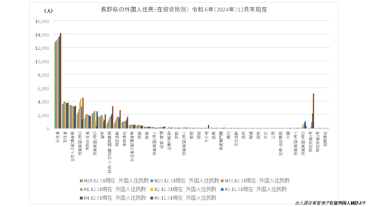 - 長野県の外国人住民統計は外国人労働者の家族や子供も含まれており、永住者では中国が4,754人、定住者ではブラジルが1,049人と最も多くなっています。最長5年の長期滞在も許可される在留資格の特定技能導入を受けて今後ベトナム人の定住化も加速されると考えられます。