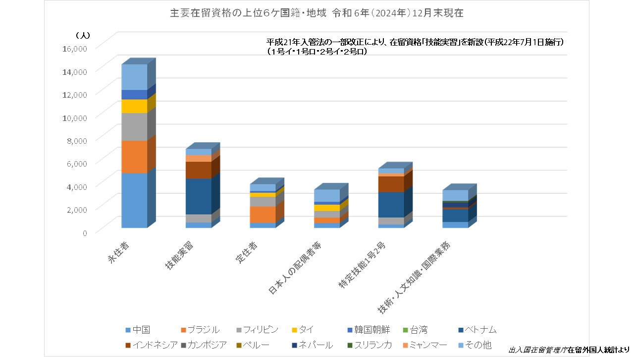 外国人住民数の主要在留資格の上位6ケ国籍・地域