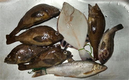 今度は、ネット付きカレイ仕掛にイソメをつけて、3本の竿を振り込んだ。竿先をプルプル震わせるアタリが続いた。それはカレイと思わせるものではなく、竿先を微妙に震わせるアタリだ。引き上げてみると、小サバだった。その小サバもワカサギと紛う(まがう)ばかりの大きさだ。どの竿にも、小サバばかりがかかってくる。比較的よいアタリがあったのはドンコだけだ。
