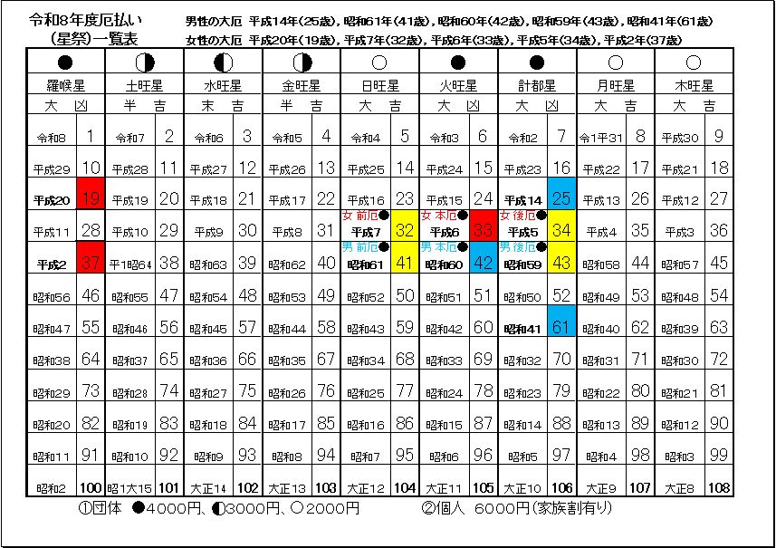 大厄の数え年19・25・33・37・42・61の含まれる星は当然大凶の黒星ですし、