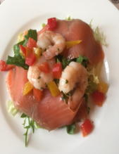 サーモンと小エビのサラダ仕立て | 北海道産ポークフィレ肉のソテー 白バルサミコクリームソース |