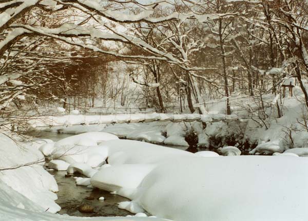 3時間かけて大石橋に着く。大石橋は夏のあの賑わいはどこへ行ったやら。どっしり雪を抱えて、荒川までも眠っていた。
