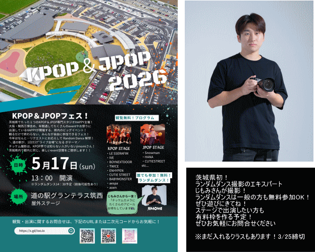 | スタジオハッピーでたった1つ! KPOP&JPOPカバーだけで週33クラスある カバーダンス専門スタジオです! キッズ(男子、女子、男女混合)、中高生、大人とクラス分けされています。 さらに、牛久駅前スタジオの他につくばカピオも! お好きな場所でお好きなクラスをご検討ください♪ |