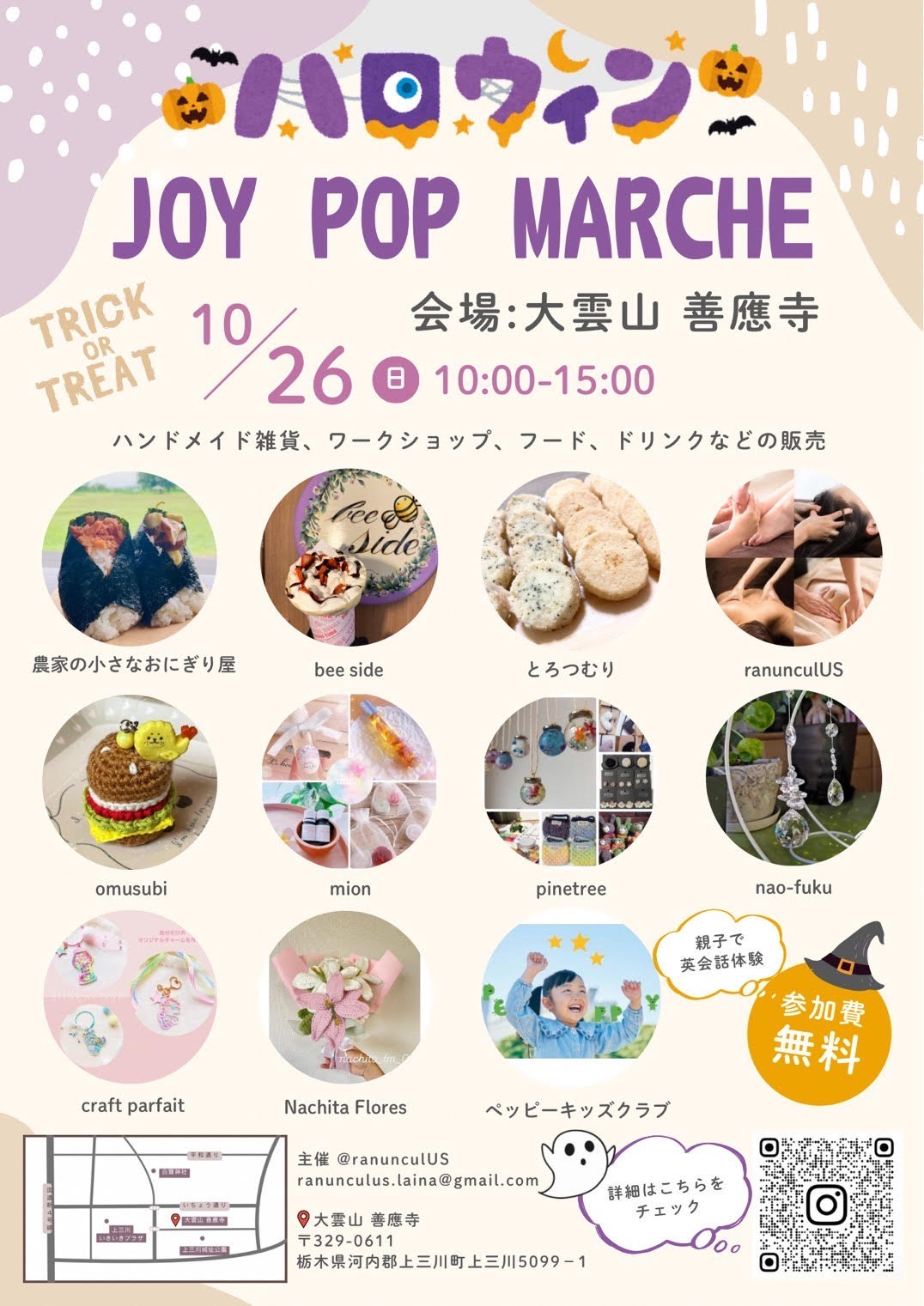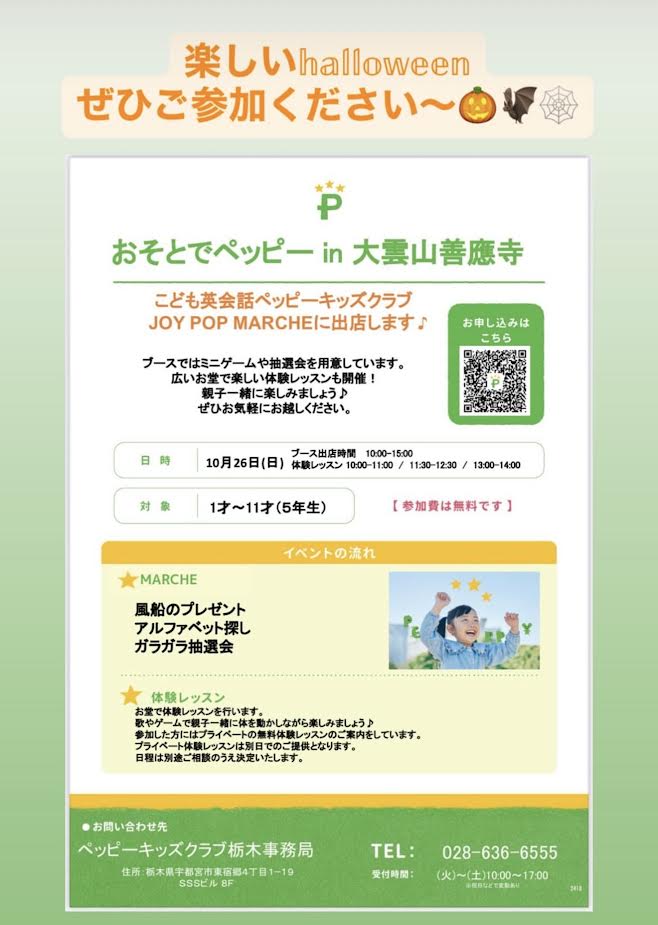 10月26(日) JOY POPマルシェ in 善應寺開催 時間 10時~15時 場所 善應寺境内、駐車場 英会話ペッピーキッズクラブ開催 参加費無料(QRより申し込み) 小さなお子さまからどなたでも参加できます。 時 間 10:00~11:00 11:30~12:30 13:00~14:00