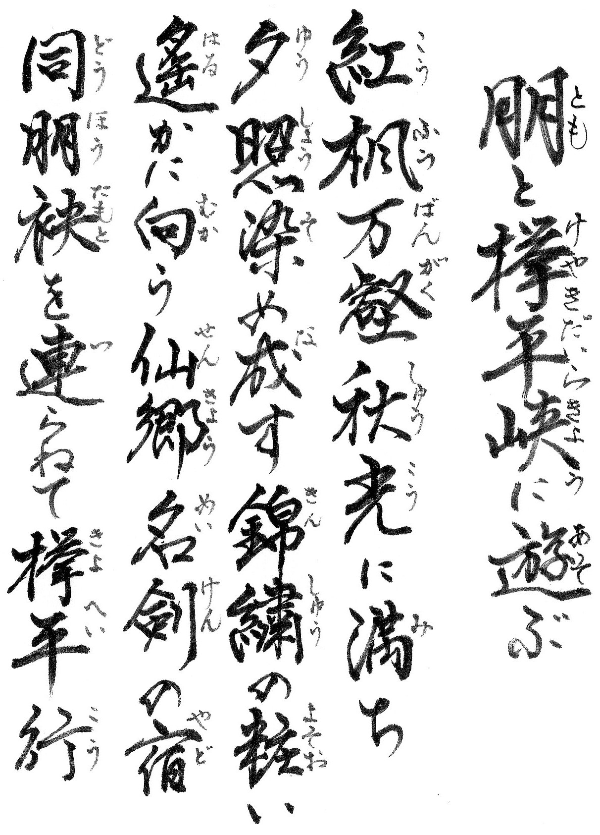 (大意) 紅葉があらゆる渓谷をうずめて秋の風情が満ち溢れている そこに夕陽があたってまさに錦の装いを染め出している はるか遠くのまるで仙人が住むような山奥の名剣宿に向かって登っていく 高校時代の友人たちが一緒に欅平への旅を楽しんだのだ 漢詩の目次に戻る