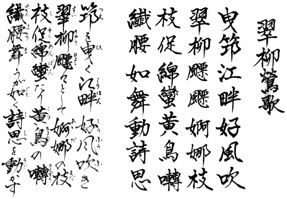 (大意) うららかな春の水辺を散歩していると顔をなでる春風が心地よい 青芽が芽吹いた柳が風になびいて柔らかくゆれている その動きに促されてか鶯のさえずる声が聞こえてくる 風に揺れる柳の枝を眺めていると思わず詩を口ずさみそうになる 漢詩の目次に戻る