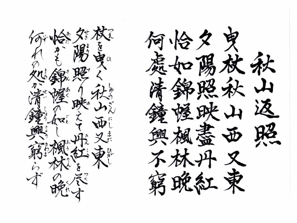 (大意) 秋色漂う山道を杖を突いてあちらこちらと気ままに歩いていた ちょうど夕陽が山を照らして真っ赤に染まっている それはまるで錦の天幕で覆ったかのような楓の林の夕景である すると何処からか夕方の鐘の音が聞こえてきて私の気持ちはますます昂ってくるのだ