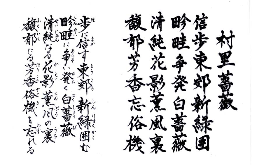 (大意) 足の向くままに春の野原を歩いていると周りは緑に囲まれており あぜ道には白いバラがまるで競うように咲き乱れていた その姿は清らかで春風に香りを乗せていた その香しい香りを嗅いでいると世俗の煩わしさを忘れるようだ