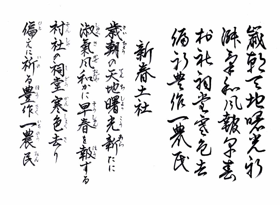 上平声十一真ノ韻 歳朝 : 元日の朝 淑気 : 新春の気 寒色 : 寒々とした雰囲気 (大意) 元日の朝、気分も新たに朝日が天地に降り注いでいる 柔らかい風が吹いて春が来たことを告げている 村の産土神社にも寒々とした気配はなくなり 一人の農民がただひたすらに今年の豊作を祈願している
