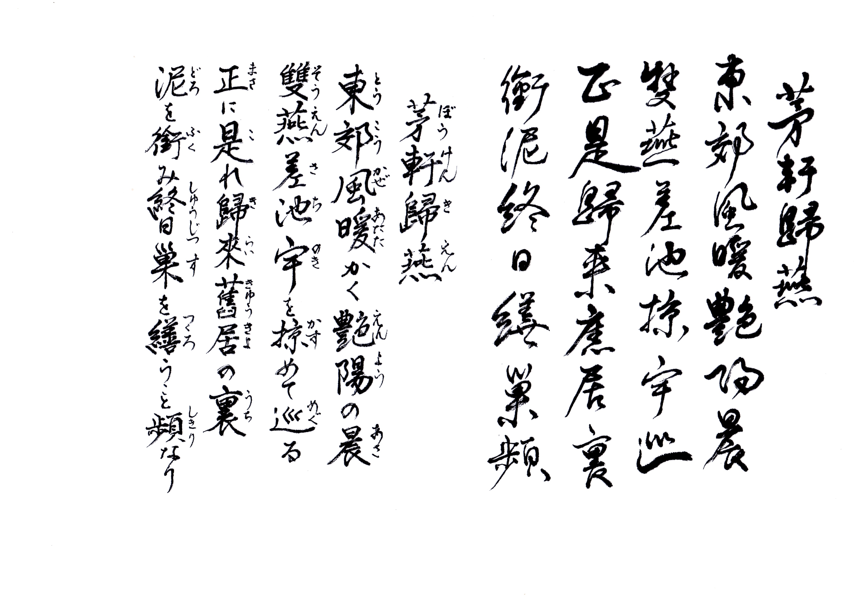 上平声十一真ノ韻 艶陽 : 晩春の季節 差池 : 高く低く上下する様子 (大意) 晩春の朝には野原に暖かい風が吹いている 二羽の燕が高く低く軒端をかすめて飛びまわっている きっとこの燕は昨年わが家の軒下から巣立ったのが帰ってきたのだろう その燕たちは一日中泥を運んできては昨年作った巣を修復していた