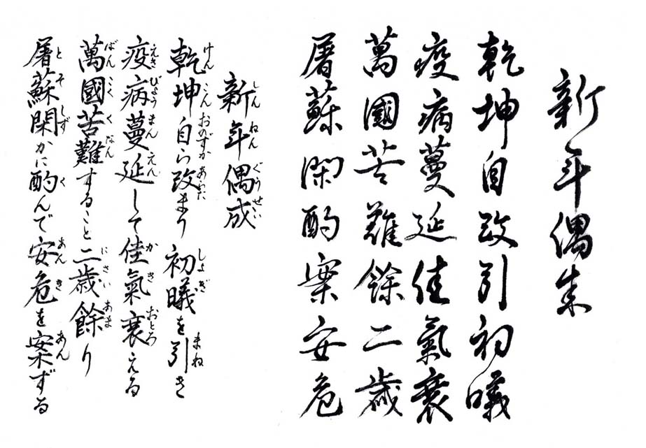 上平声四支ノ韻 乾坤 : 天地 初曦 : 初日の出 疫病 : コロナウイルスを指す 佳気 : 目出度い子持ち (大意) 新年を迎えて世の中は新しく初日の出を迎える しかし相変わらずコロナウイルスが蔓延して目出度い気持ちも萎えてしまう 世界中がコロナで苦しめられてもう2年以上にもなる 私はお屠蘇を独り静かに飲みながらコロナがどうなるかを案じている