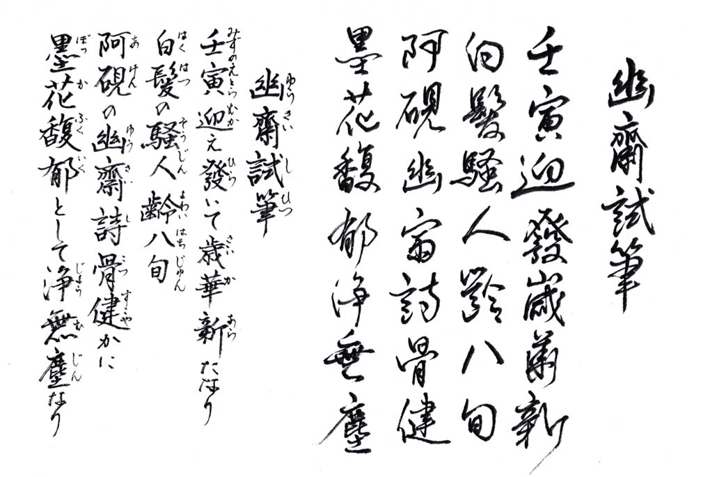 上平声十一真ノ韻 壬寅 : 令和4年 歳華 : 目出度き年 騒人 : 詩人 阿硯 : 立派な硯 幽斎 : 静かな書斎 詩骨 : 詩を作る気持ち 墨花 : 墨を摺った匂い (大意) 壬寅の新年を迎え新しい一年が始まった 白髪の漢詩人である自分はもう80歳台になった 静かな書斎で硯に向かう自分の漢詩人としての気持ちはまだまだ元気だ 部屋の中には墨の香りが漂っており、自分の気持ちには迷いが微塵もない
