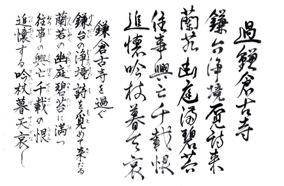 上平声十灰ノ韻 鎌台 : 鎌倉 浄境 : 静かで清められたところ 蘭若 : 寺 (大意) 詩を作るために静かな鎌倉の寺へと来てみた 静かな寺の庭には緑の苔が充ちている ここには往年の興亡の怨みが幾重にも積み重なっている 昔を偲みながら詩を作っているといつか夕方になっていた