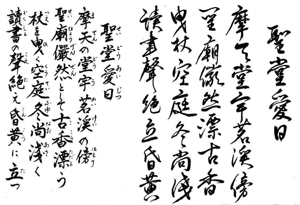 上平声七陽ノ韻 摩天 : 天まで聳えたつ 堂宇 : 寺社のお堂 厳然 : おごそかな様子 (大意) 天に聳えるようなお堂が茗渓のほとりに建っている その湯島聖堂はおごそかで古風漂う雰囲気を醸している 自分は初冬のひとけのない湯島聖堂の庭に立って 読書の声もない静かな中でただ一人黄昏の空を眺めている