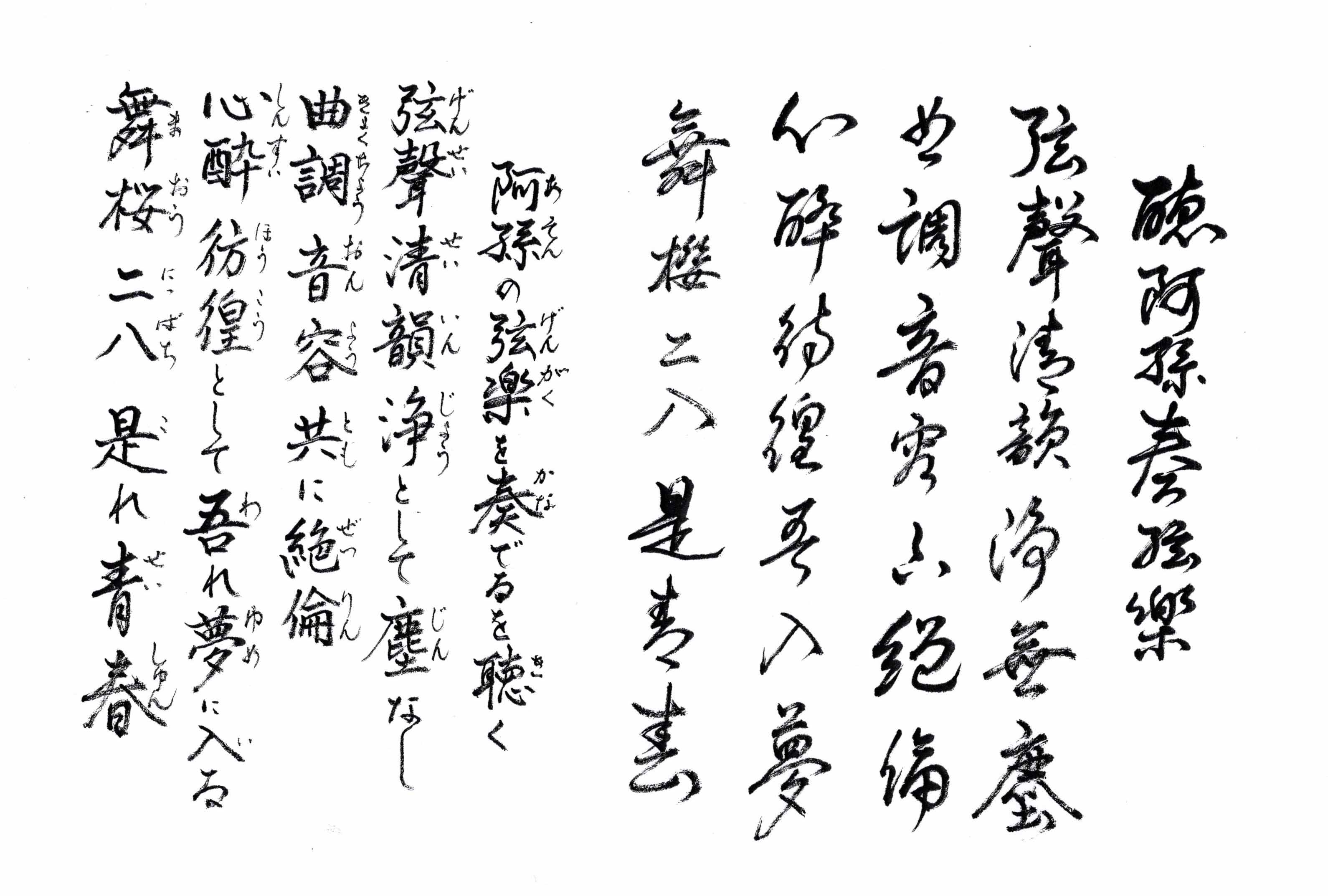 上平声11真ノ韻 弦聲 : ビオラを奏でる音 清韻 : 清らかな響き 音容 : 音楽の描き出すイメージ 彷徨 : さまよう (大意) 孫が発表会で奏でるビオラの音を聞いているとそこには何ら穢れを感じさせるものはない メロディーとそこから湧き出る音の世界はともに絶品だ 自分は孫の音楽に陶酔して夢の世界に入っていくのを感じる 孫の舞桜ちゃんは16才、まさに青春の真っただ中にいるのだ