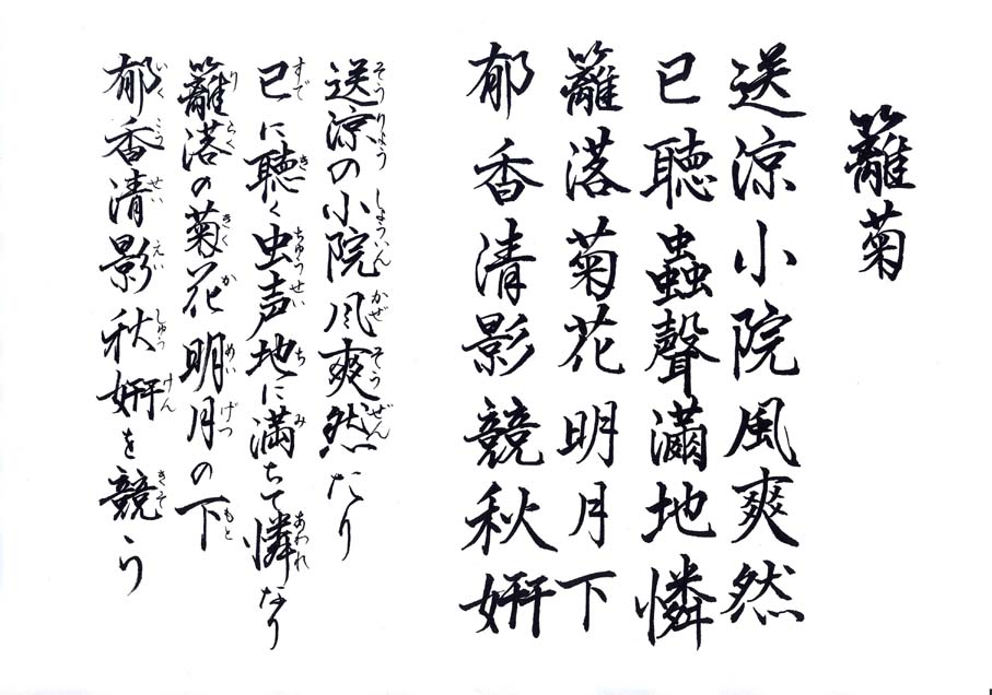 涼しい風が狭い中庭に吹き込んできていて一層さわやかに感じられる さきほどから庭のあちこちで秋虫の鳴き声が聞こえて哀れみが漂っている 垣根のあたりでは月の光に照らされた菊の花がひときわ鮮やかで 虫の声、菊の香り、月の光とあたかも秋の美しさを競っているようだ 漢詩の目次に戻る