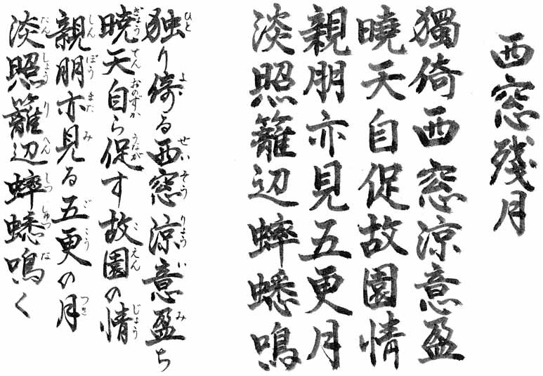 独り西窓に寄りかかっていると肌に涼しさが浸みてくる じっと明け行く空を眺めていると次第に故郷のことが思い出されてくる 親しかった故郷の友人たちもこの明け方の月を眺めているのだろうか 月の明かりに淡く照らされた垣根のあたりでコオロギが鳴いている 漢詩の目次に戻る