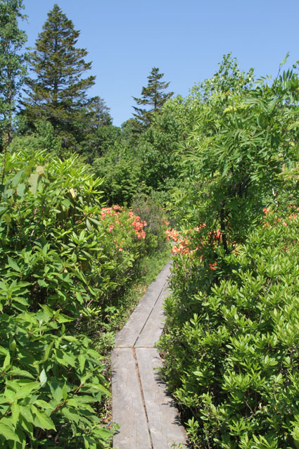 | ↑ 木道の側にはレンゲツツジ・イワカガミ・ワタスゲが咲いています |