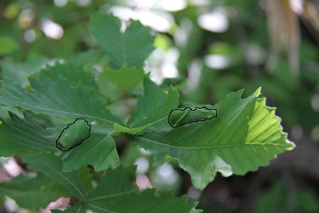 | ↑ 北側は広葉樹林帯、ブナの葉っぱに昆虫「オトシブミ」が木の葉を巻いた揺籃(ゆりかご)を見つけました | ||