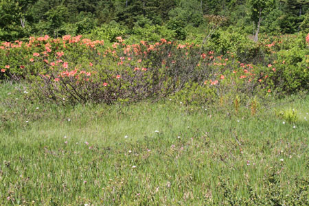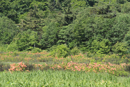 | ↑ 湿原の木道周辺はレンゲツツジが咲き誇って・・・ | ||