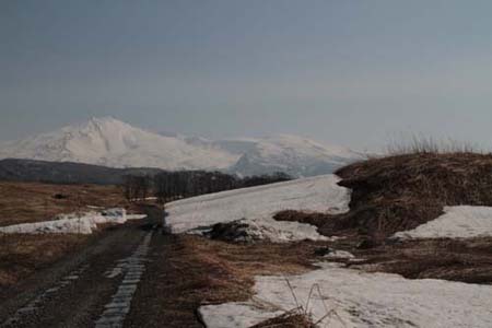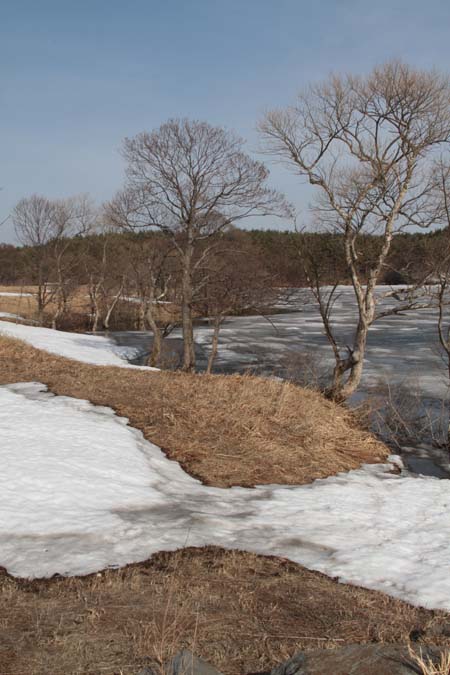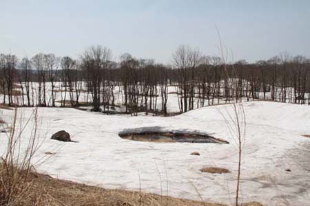 ↑ 厚い残雪に阻まれた原野 ↑ 日差しが作るまだら模様の雪