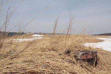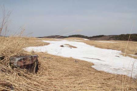 ↑ 広大な湿原の丘陵地は倒れた枯草でいっぱい、間もなく野焼きでを迎えます