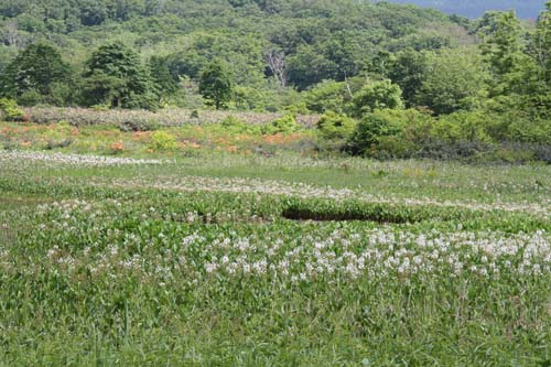 | ↑ 湿原の入り口はミツガシワの群落 | ||
