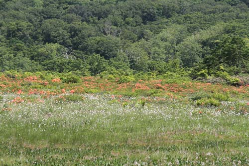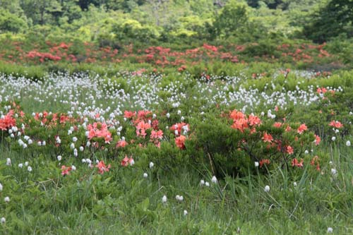 | ↑ ワタスゲとレンゲツツジが混在して鮮やかな色彩です | ||