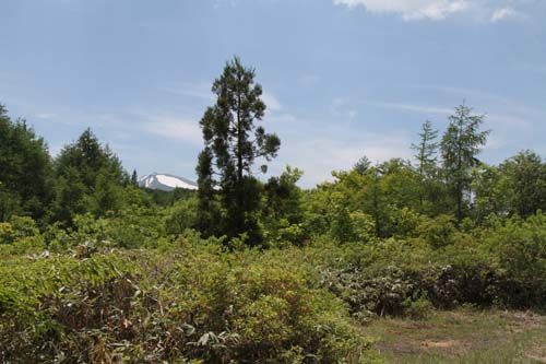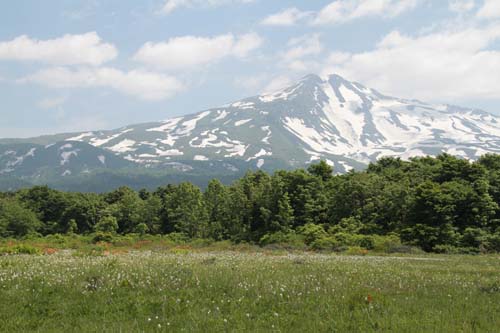 | ↑ 湿原の周辺は杉林、鳥海山が杉林に浮かんでいます--鳥海山の全景 |