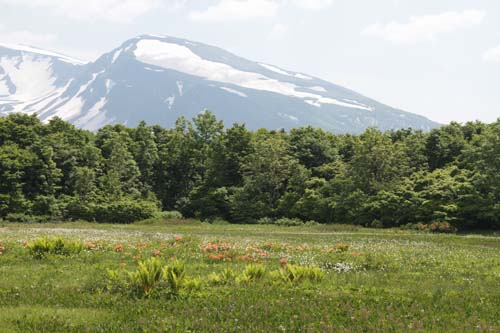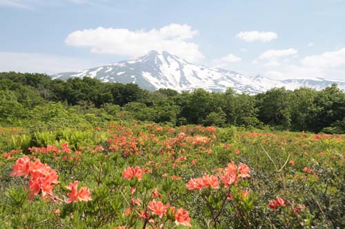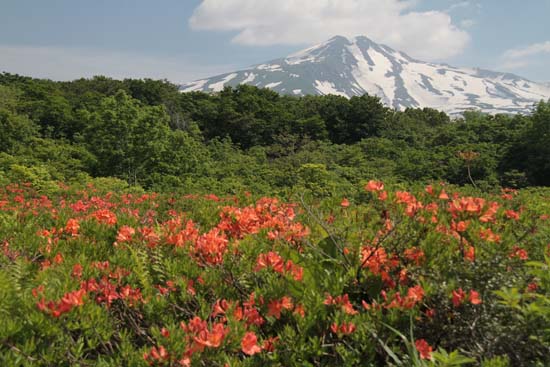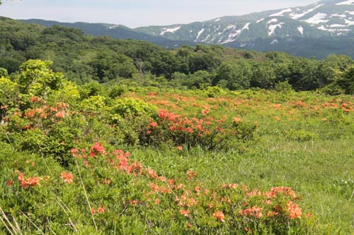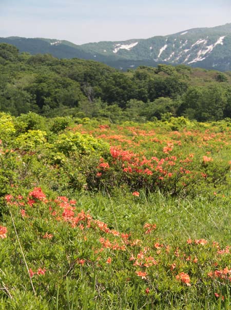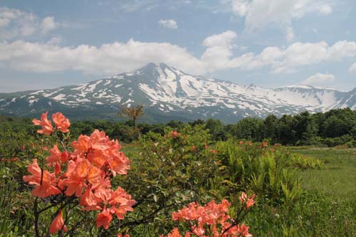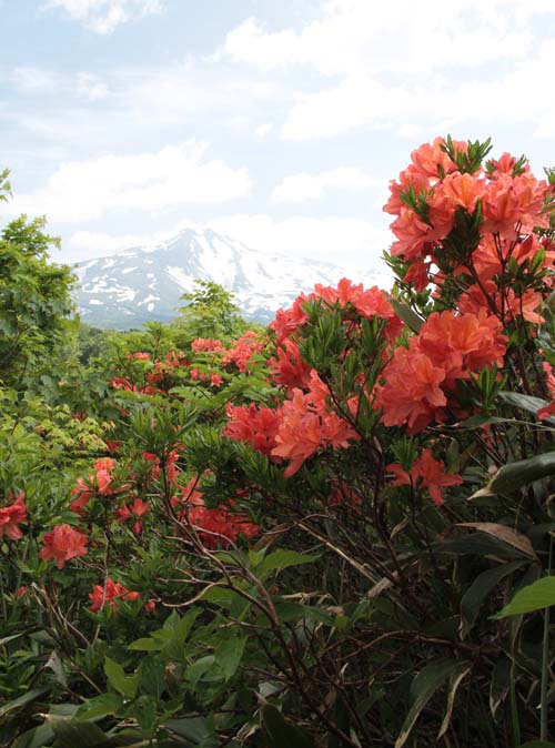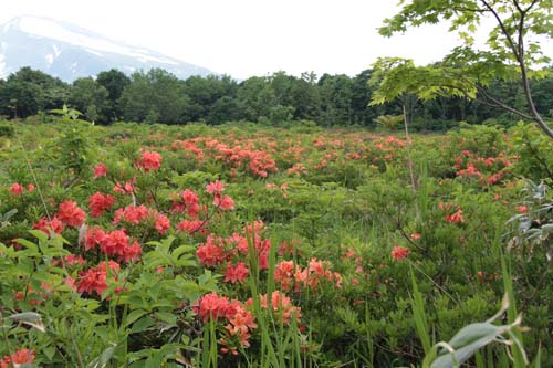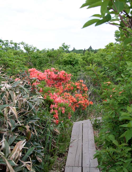 | ↑ 木道を歩きながら時々目にするレンゲツツジの中から顔を覗かせる鳥海山 |
