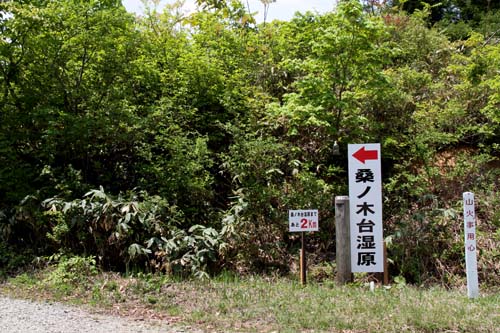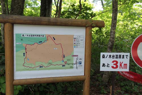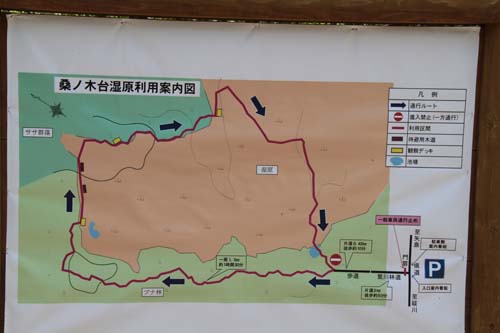| 桑ノ木台湿原利用案内図 数年前までは余り知られていなかった「桑ノ木台湿原」も 自然観察が盛んになって、今は多くの登山者が此処を訪れ ています、特にレンゲツツジの咲くこの季節は鳥海山が一 番美しく見えるので、「湿原銀座」と言われる程多く人で 込み合っています、そのためか車の乗り入れはできません 県道から歩いて約1時間で湿原に到達できます。 (桑ノ木台湿原は地元ではムラスギ湿原と呼んでいます) |