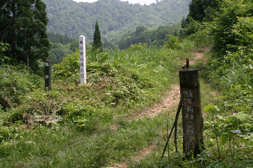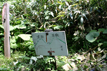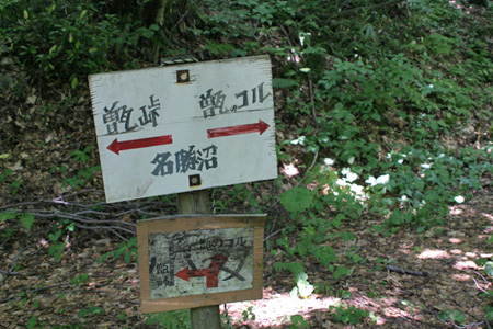| 甑山(こしきやま)登山道入口や名勝沼の案内標識 ↑ V字形の沢には残雪が見られた | ||