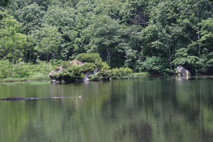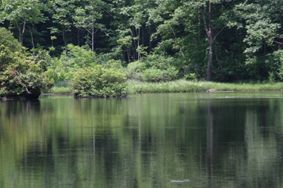 | ↑ 沼のほとりまで原生林が張り出しています |