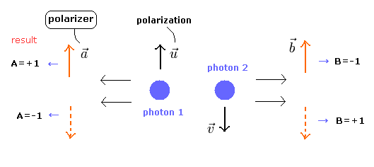 ここでは、偏光板 a と b は x-y 平面にあるため、それらは 光子のベクトル u と v に垂直である。
