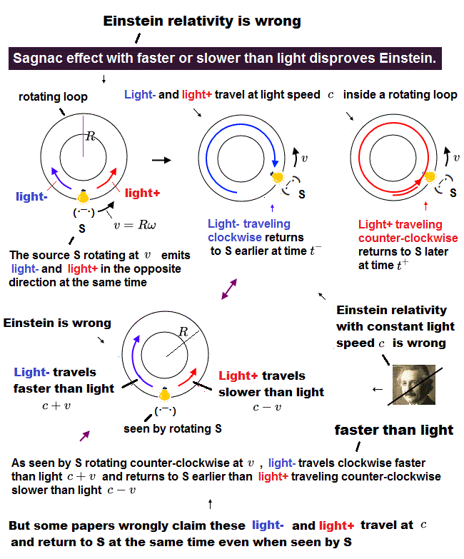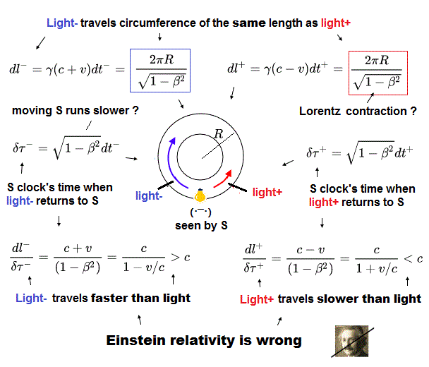 ↑ As seen by the rotating S, the light- travels faster than light (= c + v ), and light+ travels slower than light (= c - v ), which clearly disproves Einstein relativity based on the constant light speed c observed.