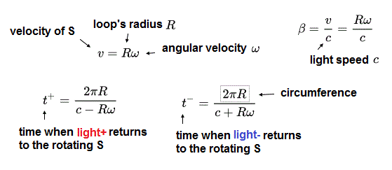 ↑ These light- (= dl- ) and light+ (= dl+ ) travel the same-length circumference of the loop ( dl- = dl+ ) to return to the S, as seen by the rotating S.