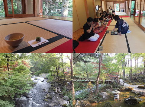 <鐘山苑 茶室> 鐘山苑では・・・庭園茶室でお抹茶と和菓子をおいしくいただきます。茶室からは桂川の清流や苔むした庭園が眺められます。 (2013年8月17日)94 |