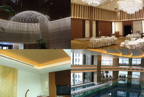 <ペニンシュラ東京> ペニンシュラ東京は西洋に和の様式がミックス。ロビーの壁は千本格子をイメージ。部屋には橡(とち)の木の引き戸と杉の網代天井を採用。宴会場の床は千代紙、壁は帯をイメージ。プールには、水面に月光が映り込む感覚で天井に楕円形間接照明。館内インテリアデザイナーは橋本夕紀夫氏。 (2012年7月28日) |