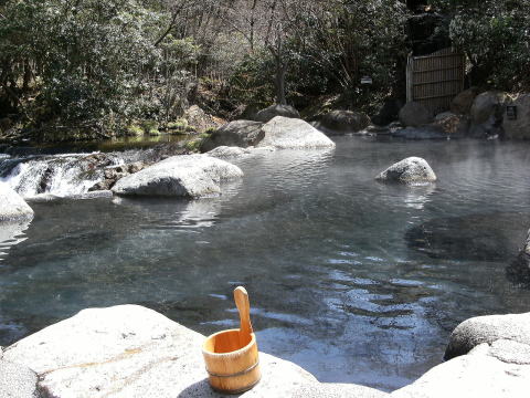 <黒川温泉> 黒川温泉の宿「山みず木」の露天風呂。川と同じ目線で、 |