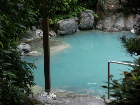 <別府温泉> 別府鉄輪温泉「神和苑」の露天風呂。鮮やかなコバルトブ |