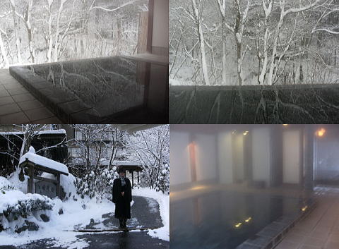 <扉温泉> 長野県扉温泉の明神館・・・半露天の立ち湯に雪化粧の木 |