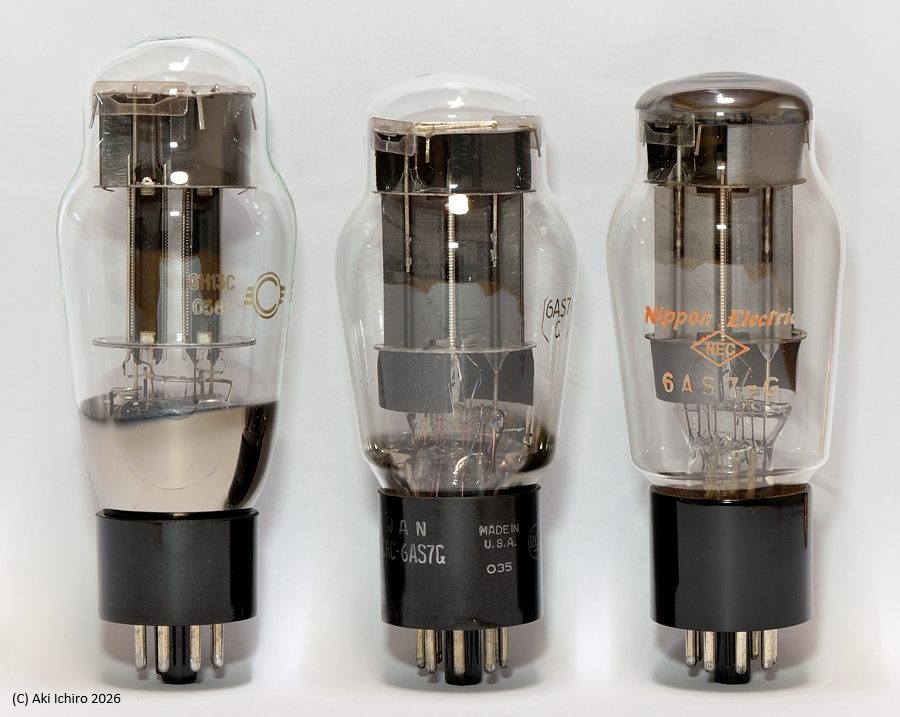 左から旧ソ連製6Н13С(6AS7G互換)、米国製6AS7G、日本製6AS7G(1954年製の中古) 6Н13Сを側面から見ると電極が2ユニットあることがわかる。上下の金属板は放熱用と思われる。 |