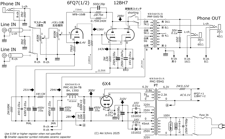 6FQ7直結ヘッドホンアンプ回路図