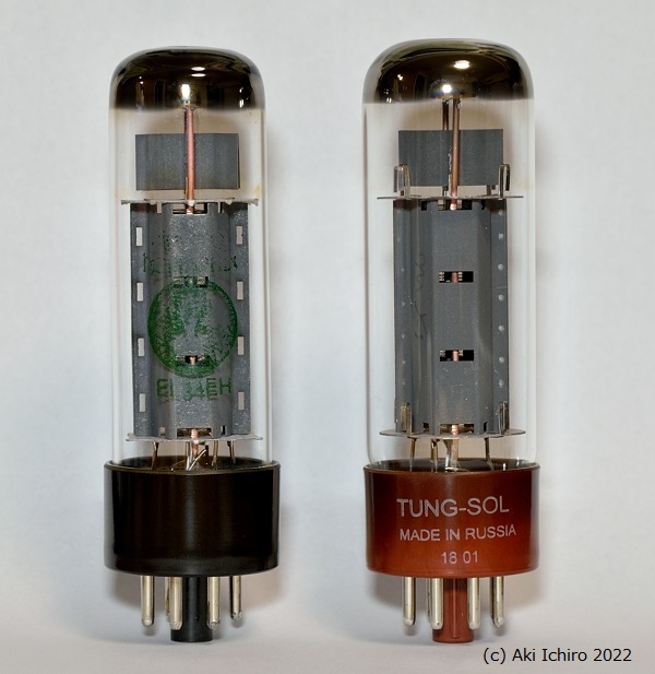 左:ロシア製エレクトロ・ハーモニクス(EH)ブランドEL34、右:ロシア製TUNG-SOLブランドEL34B