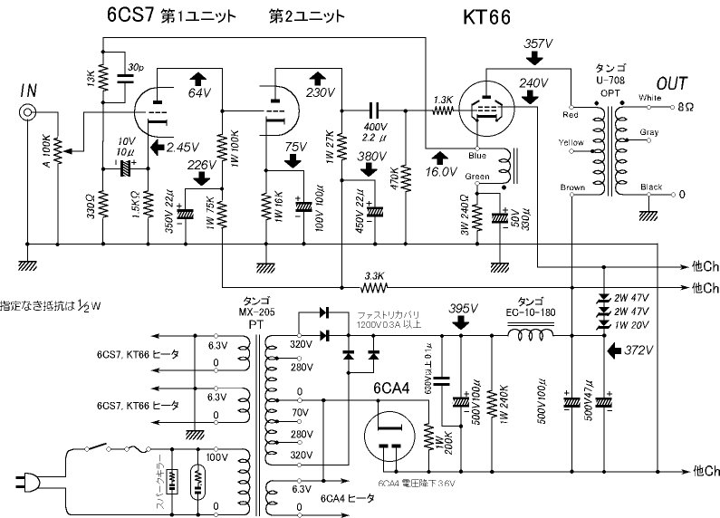 最終版の回路図です。ビーム管接続への変更のほかに、NFB回路を変更しました。NFBは約6dBかかっています。スクリーングリッドの電圧を下げるために、定電圧ダイオードを使用しています。