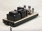 「ラジオ技術」誌1995年9月号に掲載していただいたアンプです。真空管のシーラカンスとも言うべきVT-25を並列接続したモノラルアンプです。ほとんど同じ構造の兄貴分にVT-62(801A)というタマがありますが、出物が少なくて入手が困難だったため、いつでも手に入るVT-25を採用しました。VT-25向けの電源トランスが販売されていなかったため、VT-62用の電源トランスを流用する方法を考えた結果、マイナス電源を使わないカソード・フォロワ形式とドライブ段-出力段直結方式となりました。発表時はオーバーオールNFBだけでしたが、その後カソードNFB併用に変更しました。その結果、実用部分の出力が1Wほど上がり、出力インピーダンスも意味のあるレベルで下がりました。オーバーオールNFBを切るスイッチを設けた理由は、小出力アンプではオーバーオールNFBがかえって聴感上で好結果とならない場合があるためです。オーバーオールNFBを効かせると帯域が広がりますが、パワーが分散されるのか、サウンドが平板な印象になりがちです。そこで音楽の種類やつなぐスピーカーにより使い分けられるようにしたものです。オーバーオールNFBをかけた状態では、帯域が広いのがわかるものの、オーケストラではパワーが天井に突き当たっている感じがしました。スイッチでオーバーオールNFBを切るとカソードNFだけとなり、サウンドに躍動感がよみがえりますが、演奏会場がひとまわり小さくなったような印象になります。オーバーオールNFBを切ると出力インピーダンスが大きくなるので、理屈上は低域がゆるくなっているはずですが、瞬発的パワーが出やすいのか、オーバーオールNFBをかけたときよりも自然な感じに聞こえるのが長所です。ただし低域は小型出力トランスとしての限界があり、高域よりも早く飽和してひずみが大きくなります。トリタン・フィラメントの性格でしょうか、NFBの如何にかかわらず高域が若干勝ったサウンドですが、それが楽音や音声の繊細な表現に寄与します。使用するスピーカーを選ぶアンプで、高域ホーン駆動用に適しているかもしれません。扱い方が繊細で使いこなしが難しいアンプですので、オークションには出品せずに手元に残すことにしました。