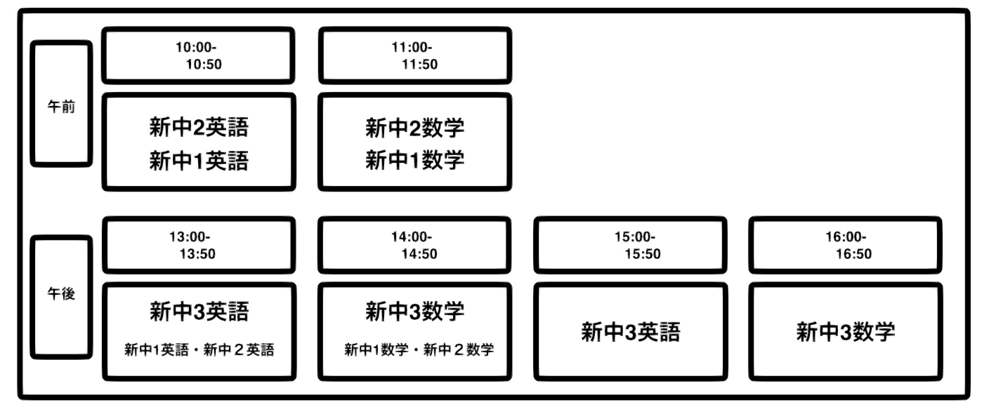 ・ 午前の部・午後の部どちらに来てもらっても大丈夫です。また、やる気のある生徒は午前・午後両方の授業を受けてみてください!