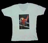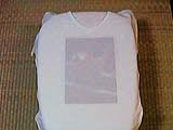 下図は完成したシャツ全体の様子です。 下図はシャツに熱転写したアイロンプリントのクローズアップです。 この原稿は、画像サイズ縦27cm横20cm、解像度72pixels/inch、画像フォーマット形式JPEG、ファイル容量36.7KByteの画像を使用しています。