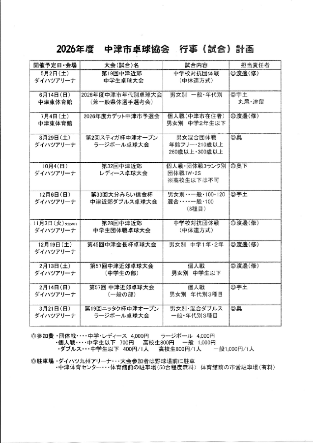 2026年度中津市卓球協会年間行事